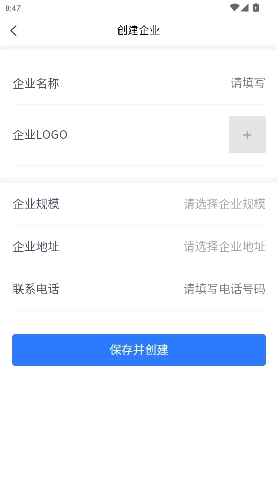 4. 填写企业名称、上传企业LOGO,选择企业规模、填写企业地址与电话号码,点击“保存并创建”按钮即可完成操作。