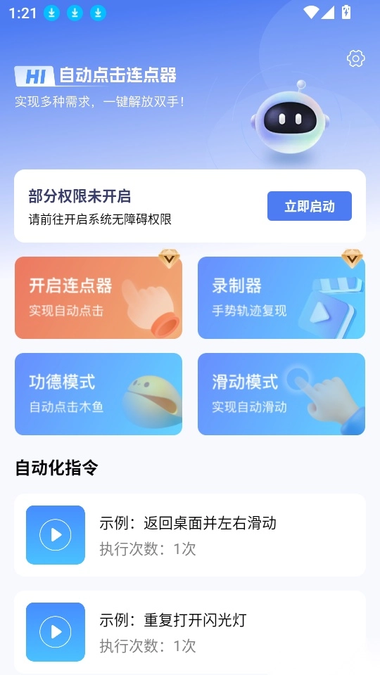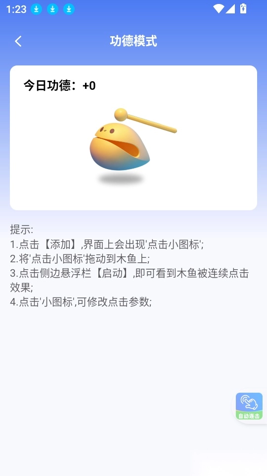 自动连点器免费版是一款专注于为用户提供自动连点功能的辅助工具。它能帮助用户轻松完成各类需要点击的任务,针对重复性操作可实现实时连点,让点击更快速、更高效,有效减轻手动操作负担,解放双手,满足多种连点场景需求。平台还支持一键录制手势,用户可快捷记录所需手势动作,自定义点击操作流程,通过输入自动化指令完成操作;此外,这款手机版免费软件还具备自动敲鱼功能,开启功德模式即可实时敲鱼,一键点击积累功德,有需要的用户不妨来本站体验使用。