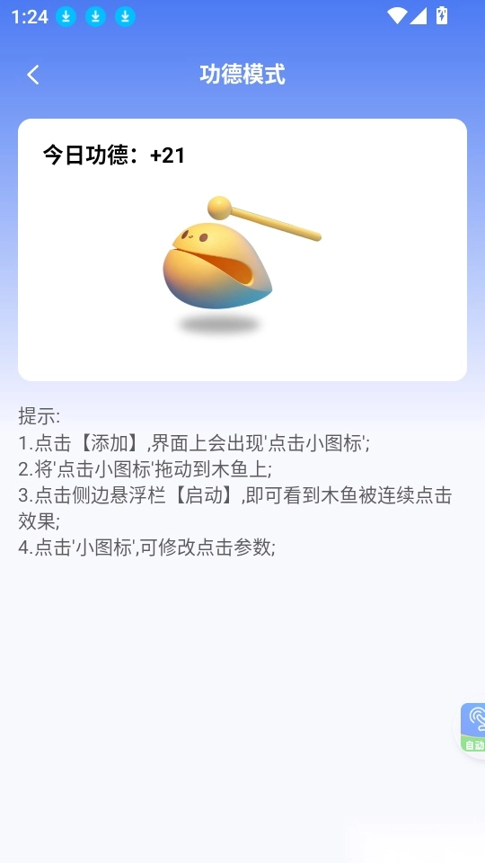 用户可开启功德模式敲击木鱼,以此积攒功德,点击次数随心而定。