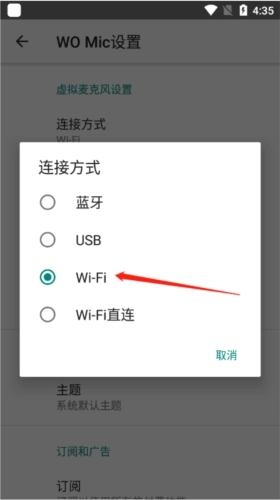 3、接下来点击连接方式,以WIFI作为传输;