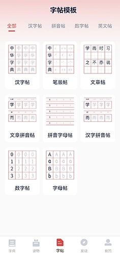 3、在字帖的这个界面上,能看到汉字贴、拼音贴和数字贴这几种类型。毕竟写字得从小抓起,打好基础才能练就一手漂亮的字。