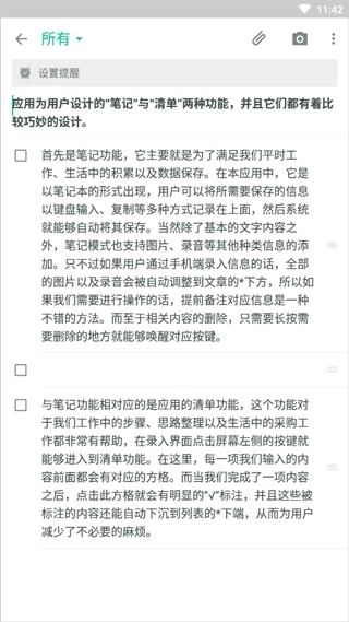 6、和笔记功能相呼应的是应用的清单功能,该功能对我们工作里的步骤梳理、思路整合以及生活中的采购事务都十分实用。在录入界面点击屏幕左侧的按键即可进入清单功能,在这里,我们输入的每一项内容前都会配有对应的方格。当完成某一项内容时,点击这个方格就会出现清晰的“√”标记,而且这些被标记的内容还能自动移到列表的下端,这样就为用户省去了不少不必要的麻烦。