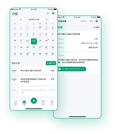 还具备维修欠款查询、个人名片发送以增强品牌影响力、计划制定以及行程提醒防止漏单等功能。