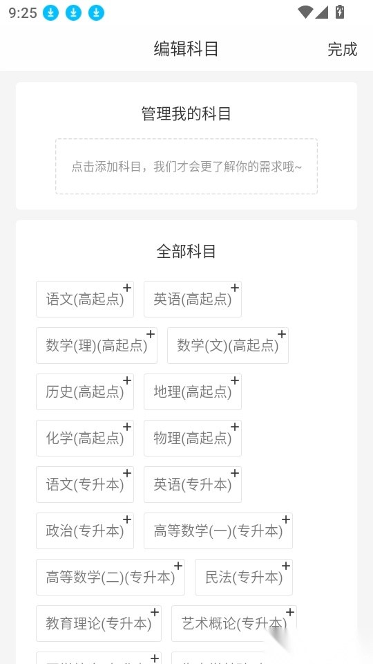 接着在“编辑科目”界面里挑选所需的科目,点击“完成”按钮以进入下一步操作。
