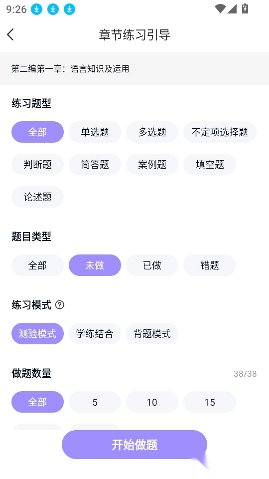 只需查看章节练习引导,选择题目类型与练习模式,再点击“开始做题”按钮,即可进入下一步操作。