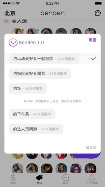BenBen是融合聊天、约会与长期关系建立功能的社交平台。借助想法互动、定制筛选、自我展示等多元途径,以新颖、轻松且富有个性的交互体验回应真实需求,推动人与人之间友谊的发展、深化与巩固,致力于为用户带来“断层级”的使用体验。