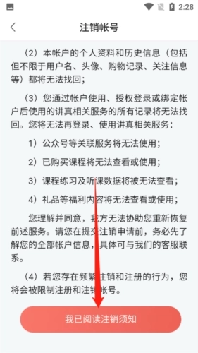 4、仔细阅读注销相关协议,确认内容无误后,点击下方的“我已阅读注销须知”选项。