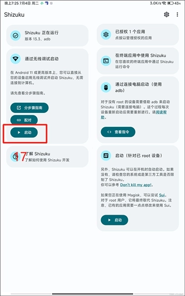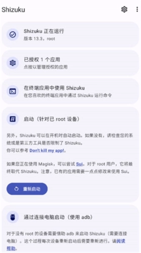 1.启动(适用于已获取root权限的设备) 2. 此外,shizuku能够在设备开机时自动启动。若未自动启动,请检查您的系统或第三方工具是否对此设置了限制。