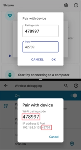 (6)点击软件里的“通过无线调试启动”选项,再点击“配对”按钮 (7)输入“配对码”和“端口号”后,点击确定完成操作