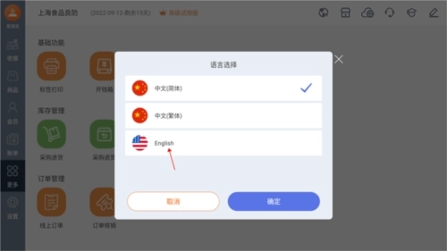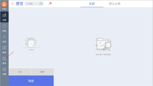 1、完成账号注册并进入系统后,默认显示的是收银功能界面,此时点击即可切换至“更多”界面。