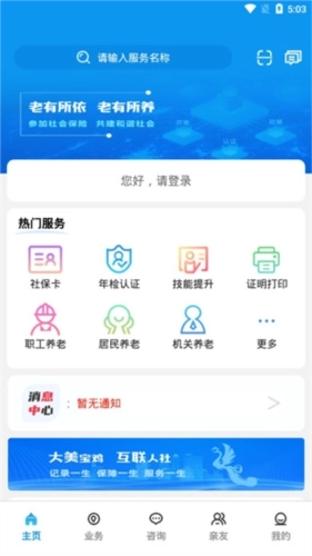 2、登入完我们在点击主页,在这里用户可以看到社保卡、年检认证、技能提升等服务,如果没有看到自己需要的可以点击更多进行查询,或者直接在上面进行搜索。