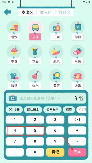 在金额输入页面,输入45元并点击完成按钮,即可完成交通支出的记账操作。