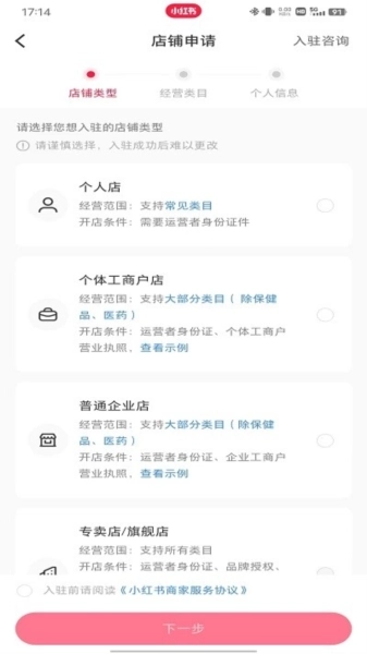 6、进入店铺申请界面后,按照系统给出的提示逐步进行操作,所有步骤完成后就能成功开店了。