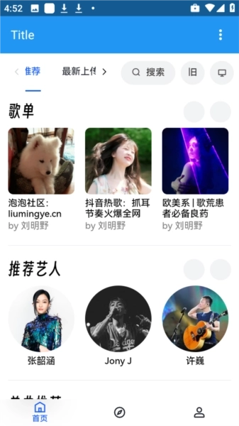 2、首页整合了热门推荐的歌曲与最新上传的音乐资源。