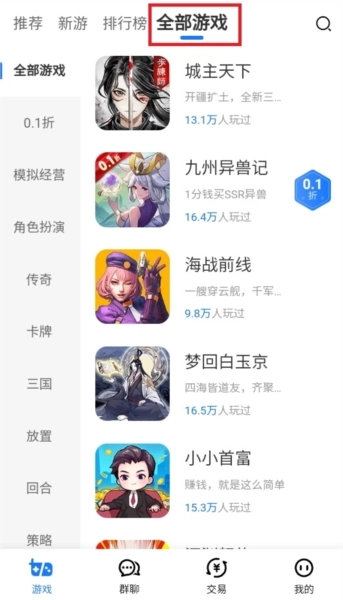 2、点击“全部游戏”可以看到各种类型的游戏;