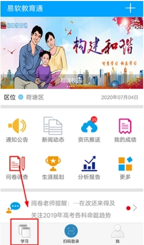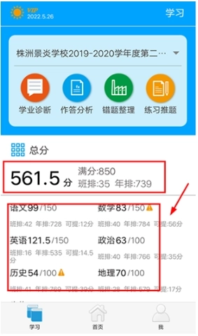 跳转至【学习】页面就能查看成绩,页面上方的【学业诊断】和[错题整理]还具备其他功能。