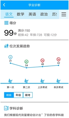 点击【学业诊断】,剖析学习优势与不足,助力学生实现成绩的突破与提升。
