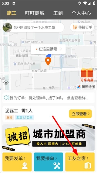 2、在软件主界面找到“工友之家”选项并点击,即可进入工友之家页面。