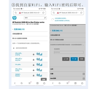 2、若您的打印机是刚出厂且未进行任何配置,可打开手机WiFi,找到并连接打印机的WiFi(WiFi名称通常为打印机型号,WiFi密码请查阅打印机说明书)。具体操作可参考下图