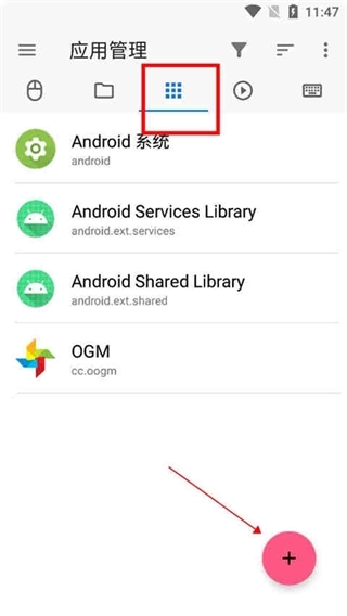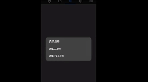 4、点击上方选项栏的“应用”选项,然后点击右下角的+号来安装应用,接着选择手机里预先准备好的apk文件。