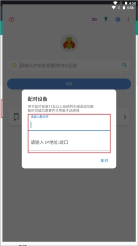 5、还能点击“使用配对码配对设备”,接着点击甲壳虫ADB助手中的“连接按钮”,通过配对码来完成连接。