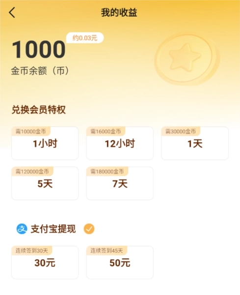3、每日完成签到即可领取金币,金币可用于兑换会员特权,若连续签到满30天或45天,还能申请支付宝提现。