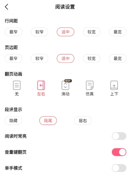 4、玩家在阅读小说时,能够对阅读界面进行自由设置,包括调整行间距、页边距、翻页动画以及段平等选项。