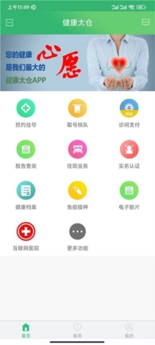 1、打开健康太仓应用,用户在首页能够使用预约挂号、排队取号、诊间支付等功能;