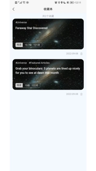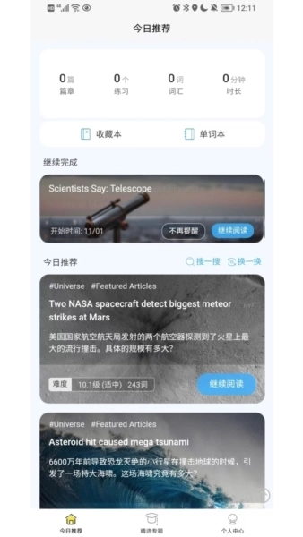 每篇文章都标注了级别和词数,难度和篇幅适中,特别适合利用碎片时间阅读。