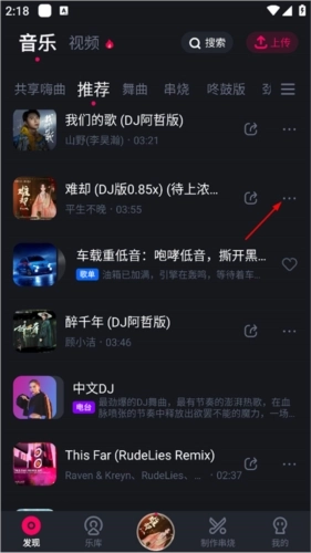 1、用户打开酷狗DJ手机版,进入发现页面,在该页面中用户能查看排行榜、DJ音乐人、推荐歌曲等内容,点击列表里需要的歌曲;