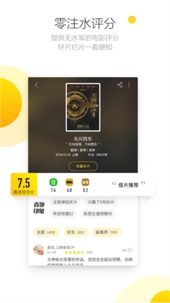 1、评电影:这里提供真实、无水军的电影评分,看片前查一下,从此告别烂片;