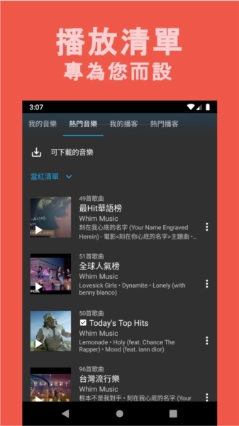 用户可以通过WhimMusic在线搜索免费音乐和播客,也可以浏览热门排行榜和每日精选的播放列表。