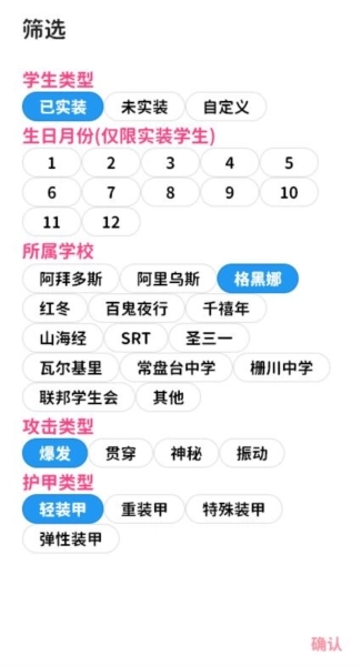 目前软件存在【学生类型】、【学院】、【攻击类型】、【防御类型】等四种筛选类型,四种筛选类型可同时存在,但每种类型中只可以选择一个类别(选择爆发攻击类型后,如果再次点击神秘攻击类型,后者会覆盖前者参与筛选)