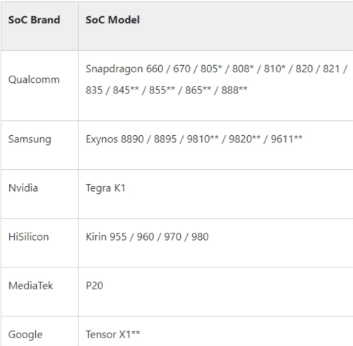 您可以通过查阅下表,获取讯连科技威力导演行动版(Android)支持超高清(4K)视频编辑与制作的移动设备系统芯片清单。