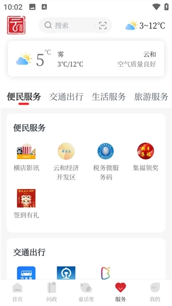 4、在服务界面下,我们能够享受到一系列便民、交通、生活、旅游服务。