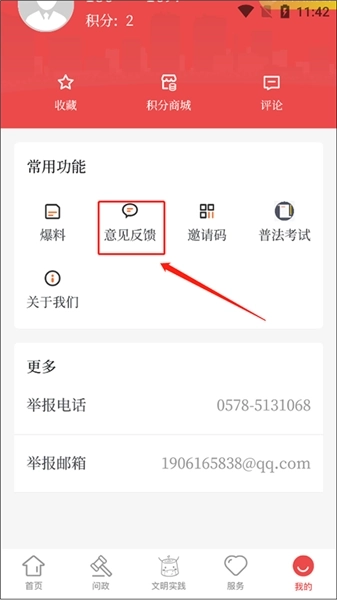 2、在“我的”页面选择“意见反馈”功能。