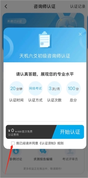 勾选“我已同意并阅读《认证须知》规则”,然后开始认证答题就行。六爻初级咨询师认证考试总共有20道题,每题5分,总分达到60分就能及格。(初级咨询师认证的首次考试是免费的,每个月有三次考试机会)