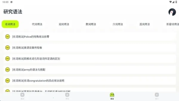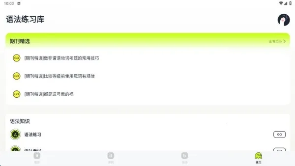 这款学习方式丰富多元。首页设有词语讲解与句子类型板块;单词页面支持制定每日背单词计划,运用科学记忆模式助力记忆;语法页面提供细致讲解,帮助用户掌握基础语法知识;练习页面则能让你学习答题技巧并开展针对性题目训练。