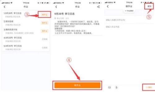 首页→学习进度→面授→作业→点击需完成的作业→输入标题与内容后点击提交即可。(作业未完成时可点击暂存)