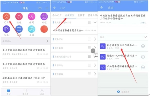在iOfficeMX办公界面中,点击“门户”按钮后,于“频道栏目”里选择对应的科室与栏目,就能查看相关内容;若有附件,还可借助手机自带的阅读工具进行浏览。