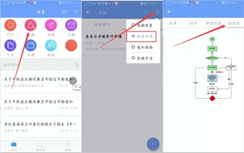若您想查看申请进度,操作步骤与之前一致:首先进入“流程”页面,点击右上角的图标来筛选不同状态,这样就能浏览所有和您相关的流程记录。点击具体流程的标题进入详情页后,便能查看该流程对应的表单信息、附件材料、流转环节以及当前所处的状态。此外,点击页面中的跟踪图,还可以实时掌握申请进度——其中绿色标记代表已完成审批的步骤,蓝色标记则显示当前正在处理的环节。
