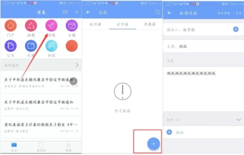点击右下角的“+”号就能发起新的传阅,填写好标题和内容,选定传阅对象后,点击右上角的“发送”按钮,OA系统就会把你的传阅信息直接传递给对方。另外还有个小惊喜:附件可以添加图片、视频、文档、语音等多种类型的文件哦。