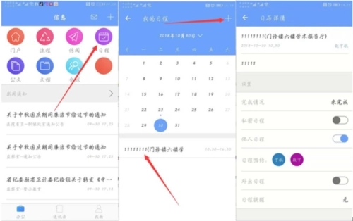 在办公界面找到“我的日程”并打开,点击日程表右上角的“+”号就能添加新的日程。系统会对已经有日程安排的日期做特殊标记,点击这个日期就能查看对应的日程,进入后还能看到日程的详细信息。