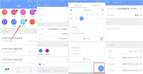 当你想了解会议相关内容时,可通过OA系统的“会议”板块进行查看。带有“蓝点”标识的日期意味着当天存在会议安排,选定该日期后,当天的所有会议便会展示在日期栏的下方。点击进入某一个会议,就能查看该会议对应的时间、附件文档等详细信息。此外,点击页面右下角的“+”按钮,还可以完成会议室的新建操作。