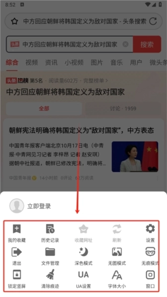 4、点击下方菜单栏,可以查看历史记录,设置无痕模式等