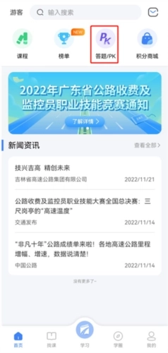 1、双击启动高速学堂软件,接着点击软件顶部的“答题/PK”选项;