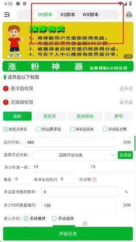 然后安装看播助手,打开后在首页上方对不同平台的脚本进行设置。