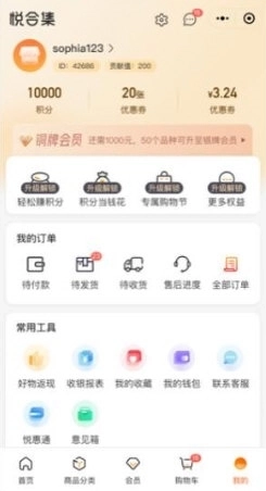 1、悦合集进入软件,进行各类商品在线浏览;