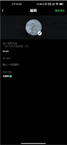 3、在这里就可以输入自己的名称、签名以及国家/地区,单击“确定修改”即可完成。