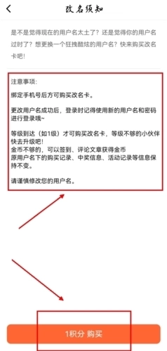 4、最后就可以用积分购买改名卡,购买后需按照注意事项操作,完成等级、手机绑定等要求后,即可开始修改名字。